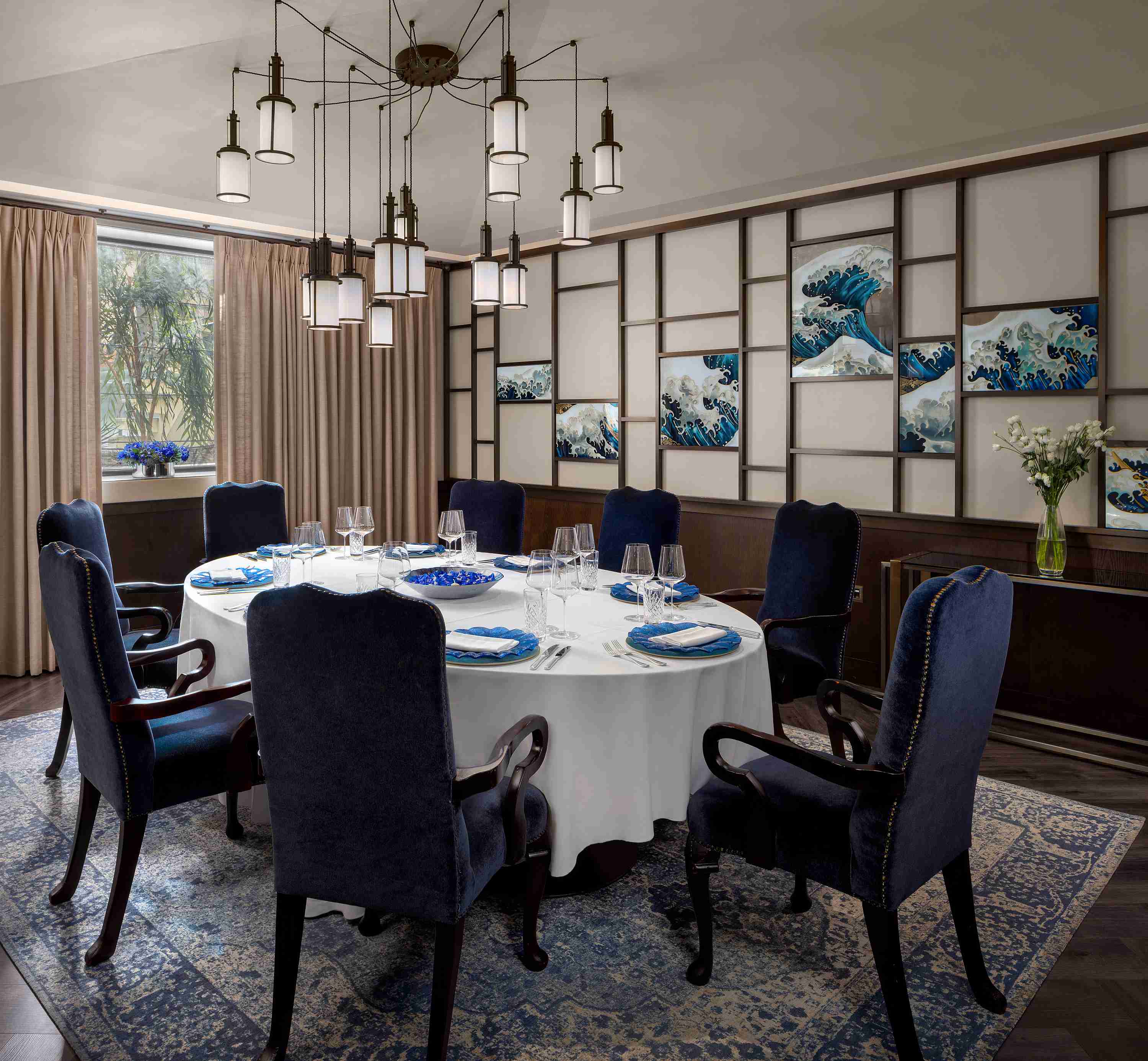 Step into the Chairman's Room, an elegant sanctuary for private dining in Mayfair. With herringbone dark wood floors, a crystal chandelier, and captivating artworks, every detail exudes luxury and refinement. A long table seats up to 14.