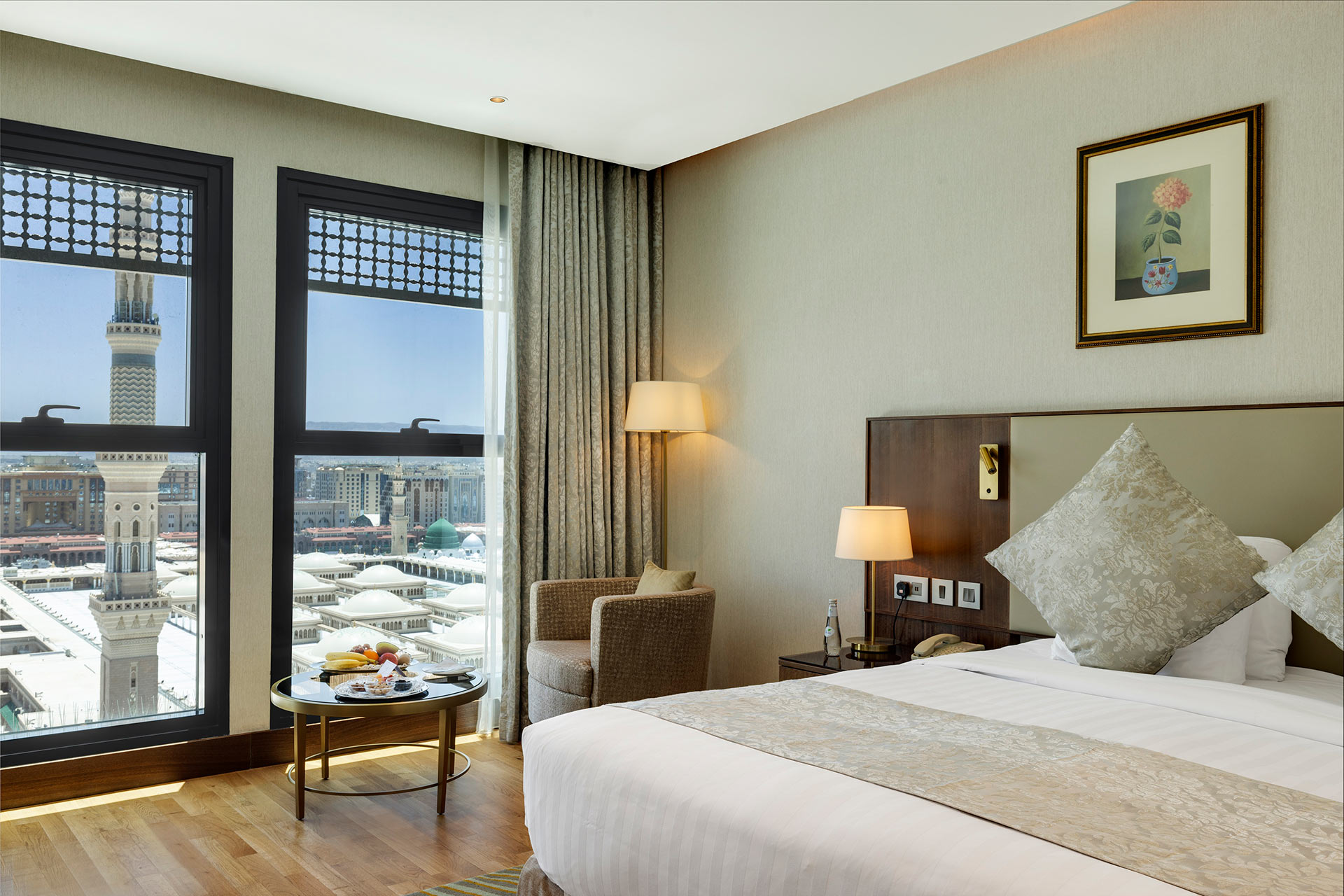 Wake up to inspiring views of Al Masjid al Nabawi in this beautifully appointed Premier Haram View King Room. Featuring a king size bed and elegant interiors, it offers a truly special stay in the heart of Madinah.